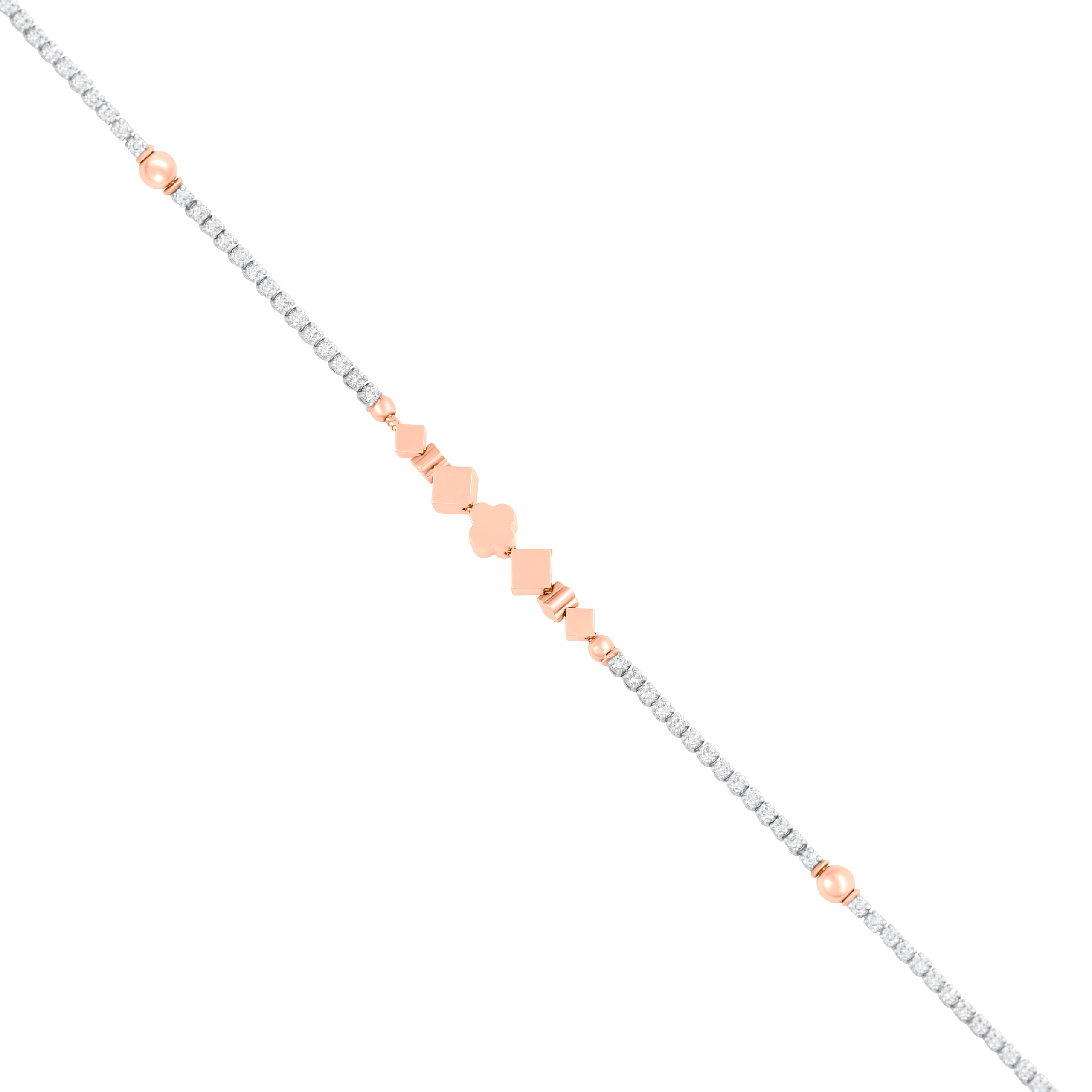 The bracelet is a classic tennis bracelet style, crafted from 18k white gold and fully paved with brilliant-cut diamonds. This continuous row of sparkle is elegantly punctuated by a series of rose gold elements. The centerpiece features a sequence of four geometric, clover-like shapes made from polished rose gold. These are flanked by two smooth, polished rose gold beads, one on each side. The combination of the brilliant diamonds, the warm rose gold, and the contrasting shapes creates a unique and stylish aesthetic.
