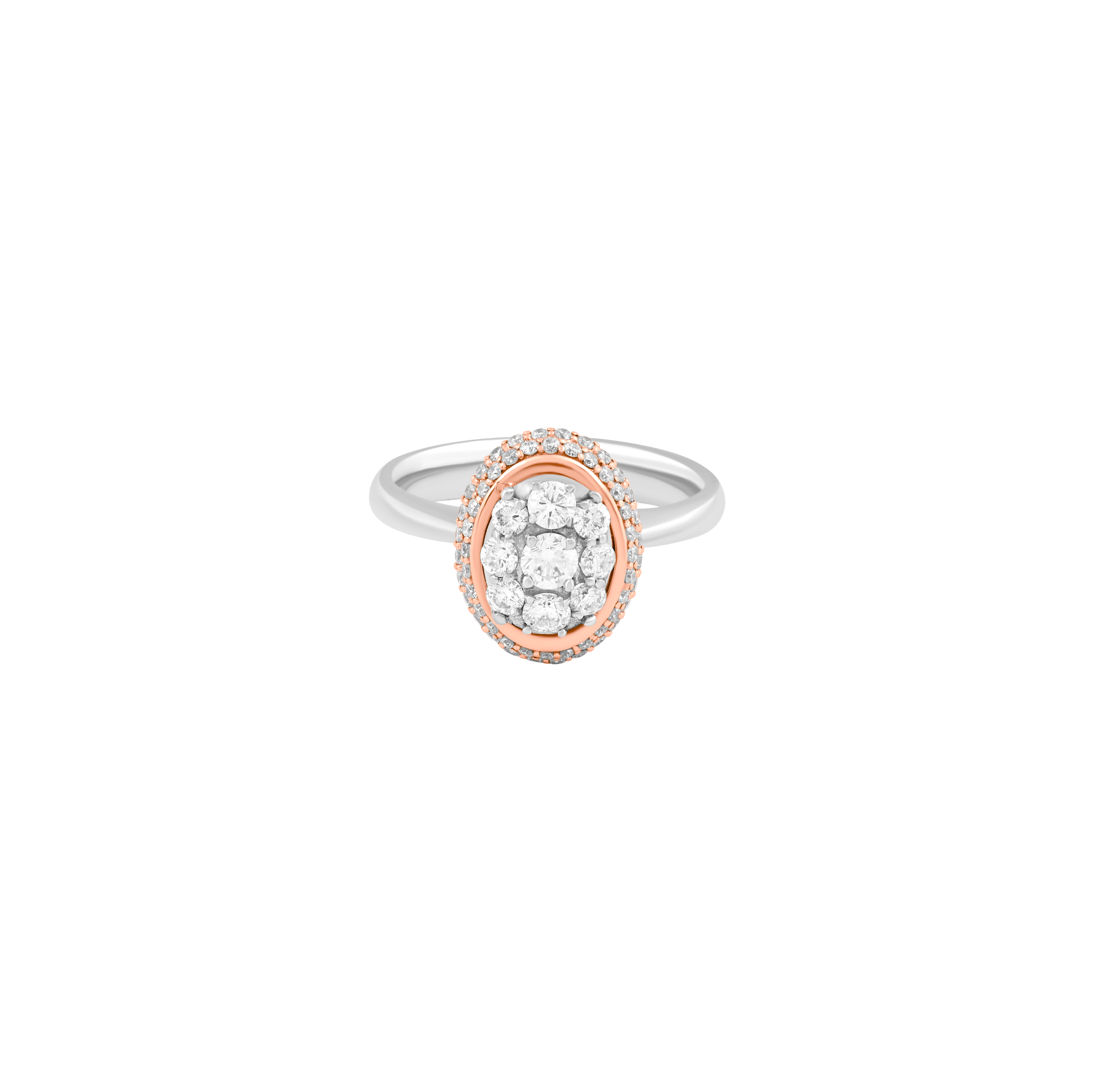 Step into a world of timeless elegance with the Royal Eternity Ring. This exquisite two-tone piece is crafted from 18k white and rose gold, creating a stunning contrast. The central design features a brilliant oval-shaped illusion of diamonds, framed by a delicate halo of rose gold, for a regal and sophisticated look.
