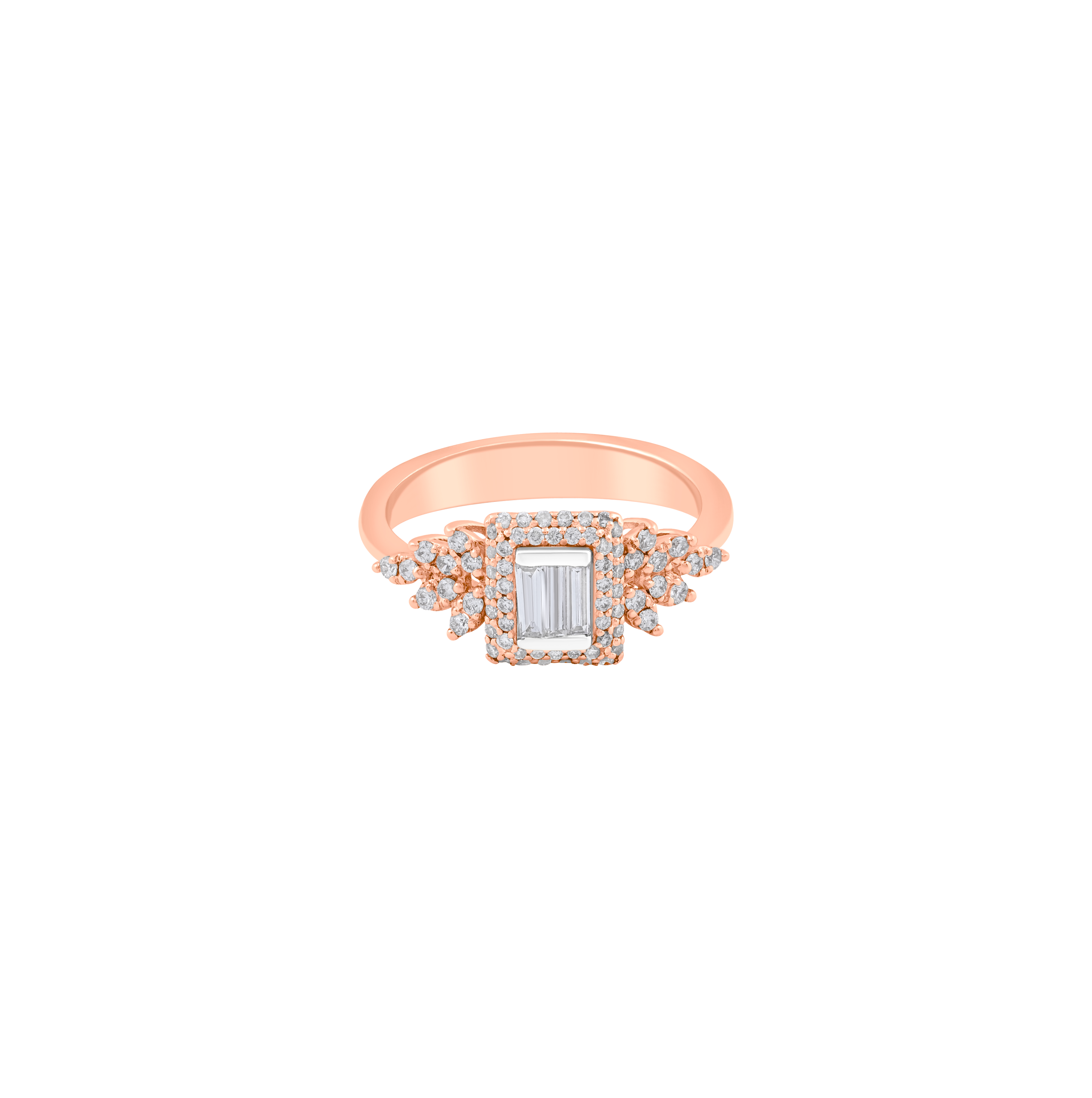 Reflect your impeccable taste with the stunning “Mirror Mirror” ring. This exquisite 18k rose gold piece features a dazzling central rectangular baguette diamond illusion, elegantly framed by a halo of brilliant illusion diamonds. A truly captivating design that adds a touch of sophistication and sparkle to any look.