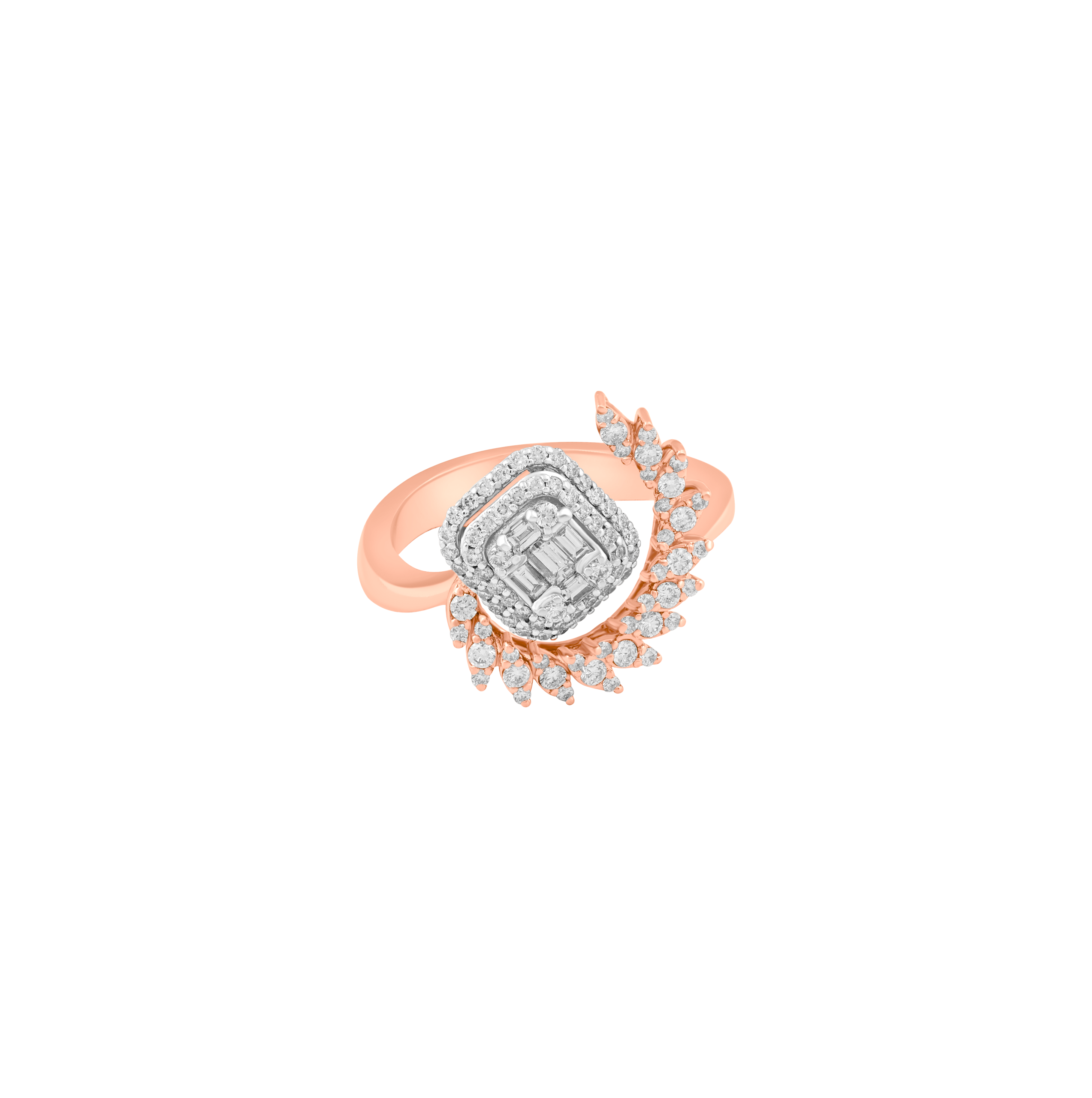 Illuminate your style with this unique Lunar half moon ring. Crafted from lustrous 18k rose gold, this piece features a brilliant cluster of square baguette diamonds at its center. The design is elegantly completed with a sweeping crescent of brilliant diamonds, creating a stunning half-moon illusion. A celestial-inspired ring that adds a touch of magic to any look.
